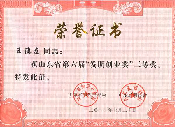 近日,從山東省知識產權局傳來喜訊(魯發協[2011]8號),集團總裁王德友喜獲山東省第六屆發明創業三等獎。
